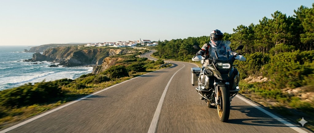 Von São Torpes führt dich die N120-1 zunächst nordwärts, vorbei an endlosen Pinienhainen und der rauen Schönheit der Costa Alentejana. Die GS läuft geschmeidig auf diesen kurvigen Küstenstraßen, während links immer wieder spektakuläre Ausblicke auf den Atlantik aufblitzen. Nach etwa 30 Kilometern erreichst du Porto Covo, ein verschlafenes Fischerdorf mit weißgetünchten Häusern und kopfsteingepflasterten Gassen – perfekt für einen ersten Kaffee-Stopp.