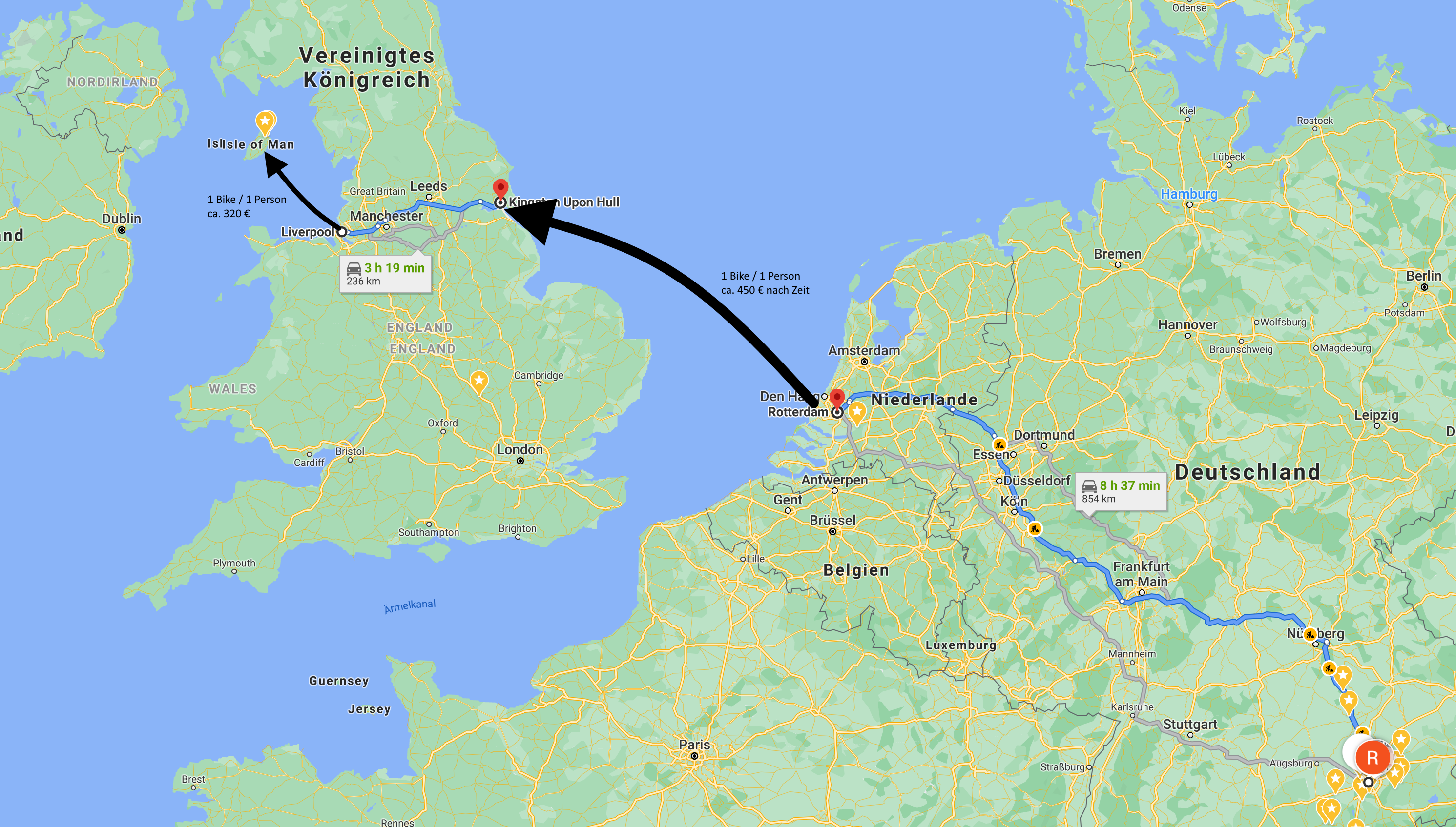 Mein persönlicher Favorit ist die Fahrt nach Rotterdam (mit PKW und Anhänger), von dort die Fährfahrt über Nacht mit Essen und Trinken nach Hull in Mittelengland. 210 km bis Liverpool mit dem Motorrad fahren um dort die Fähre (14:00 / 19:00) auf die Isle of Man zu nehmen.