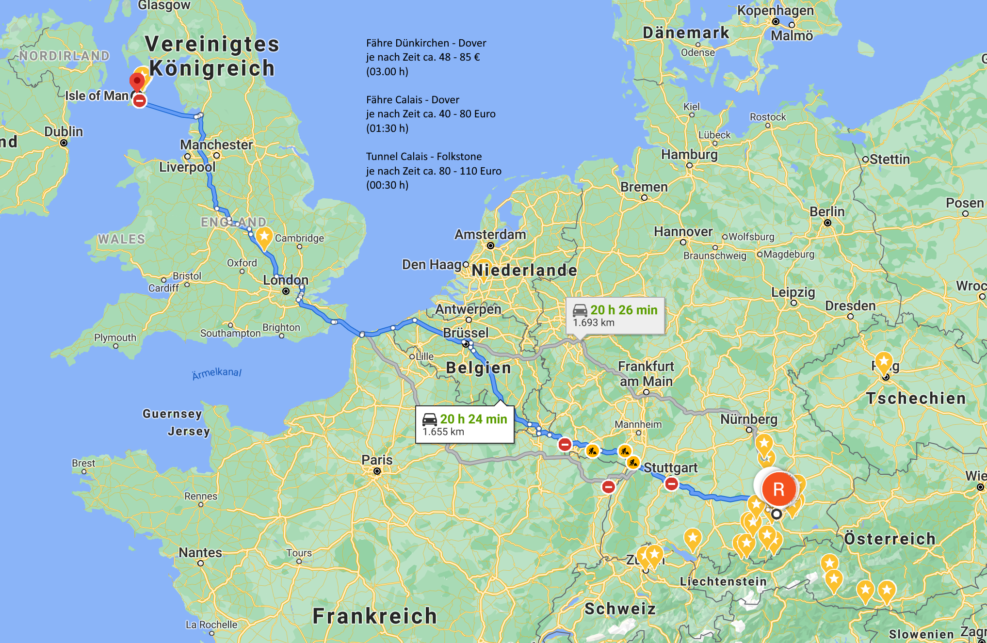 Strecke München – Dünkirchen – Dover – Liverpool – Silly Moos ist ca. 1700 km lang. Es werden mindestens 2 Fähre benötigt, bzw. eine Fähre und eine (Zug) Tunnel durchfahrt. Kosten wie im Bild zu sehen sind derzeit folgende (Stand Nov. 2020), die Abweichungen kommen durch die gewünschte Fahrzeit und inwieweit die Überfahrt vorgebucht wurde.