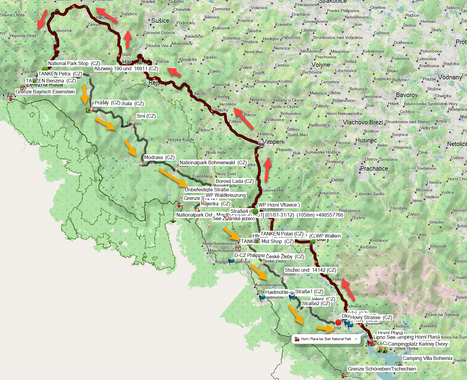 Eine Rundreise „um“ den Böhmerwald. Zuerst von Horni Plana (am Lipno) in Richtung Norden um nach ca. 100 km auf gut ausgebauten Landstraßen nochmal zu tanken und dann in diesen Abschnitt des Böhmerwaldes einzutauchen. Es geht auf kleinen und kleinsten Straßen wieder zurück nach Horni Plana, unterwegs können kurze Schotter- oder Waldweg-strecken Teil der Strecke sein. Die kleinen Strassen innerhalb dieses Abschnitts des Böhmerwalds sind wirklich sehr gut gepflegt, denn das ist eine Gegend für Fahrradfahrer. Diese Tour hat keine schnellen Strecken sondern nur Geschwindigkeiten zum „Motorradwandern“.