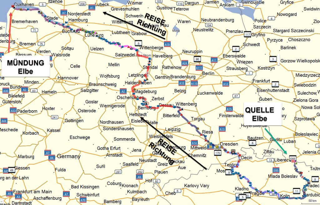 Wie läuft die geplante Strecke ? Von Cuxhaven den Fluss rauf über Hamburg, Magdeburg, Dresden, Aussig, kurzer Umweg nach Prag, Kolin und dann zur „Spindler Mühle“.